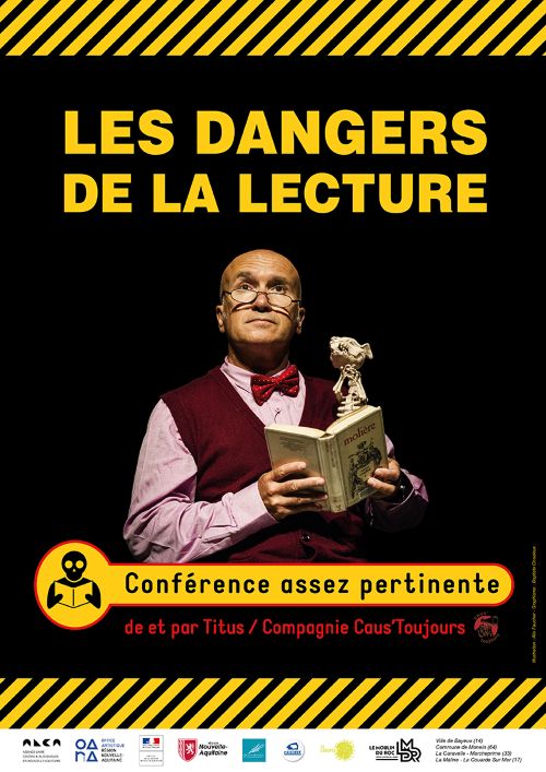 assène depuis l’enfance sur l’indispensable nécessité de lire, lui a décidé d’alerter sur les fourbes dangers de la littérature. Empruntant aux codes de la conférence (powerpoint, références, citations et autres extraits à l’appui), Titus met en garde contre la sombre influence des livres. Il joue à présenter les « dangers » de la lecture pour laisser deviner en creux ses vertus. Entre les lignes humoristiques d’un deuxième degré constant et d’une fantaisie assumée, ce spectacle porte un regard amusé sur la lecture et questionne, l’air de rien, notre relation à cette pratique.