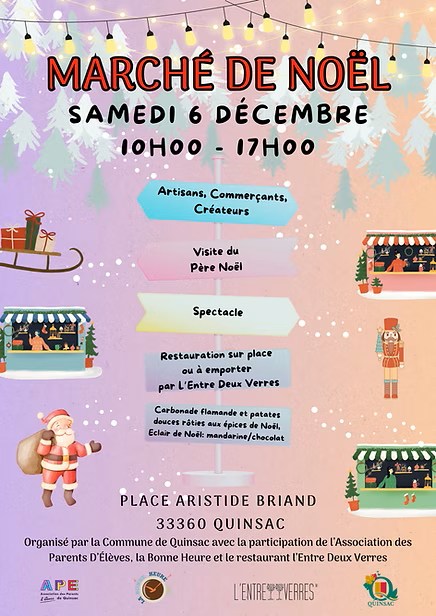 Le samedi 6 décembre, la Mairie de Quinsac vous proposent de venir partager le marché de Noel sur la place du village de Quinsac.